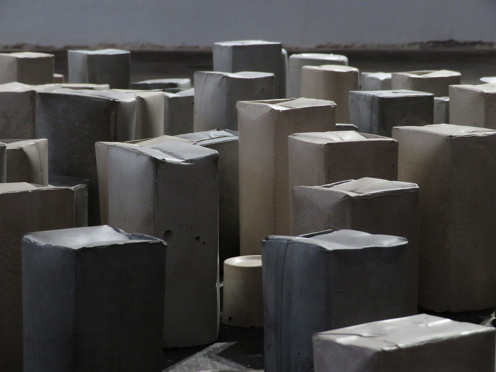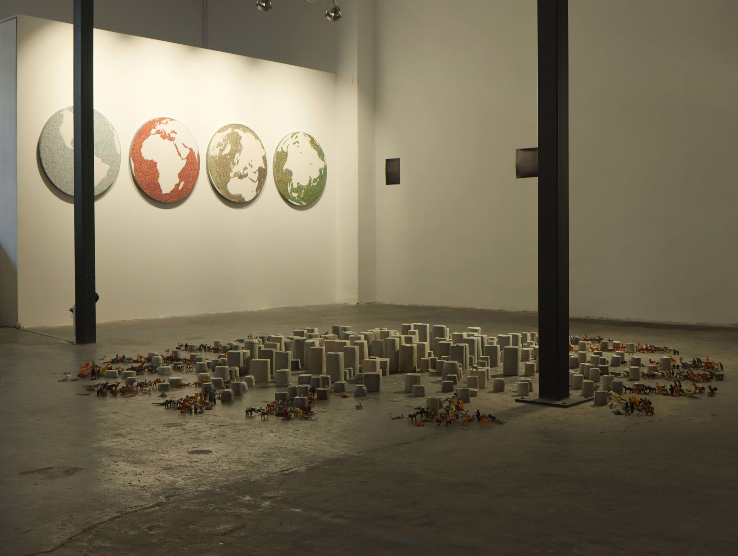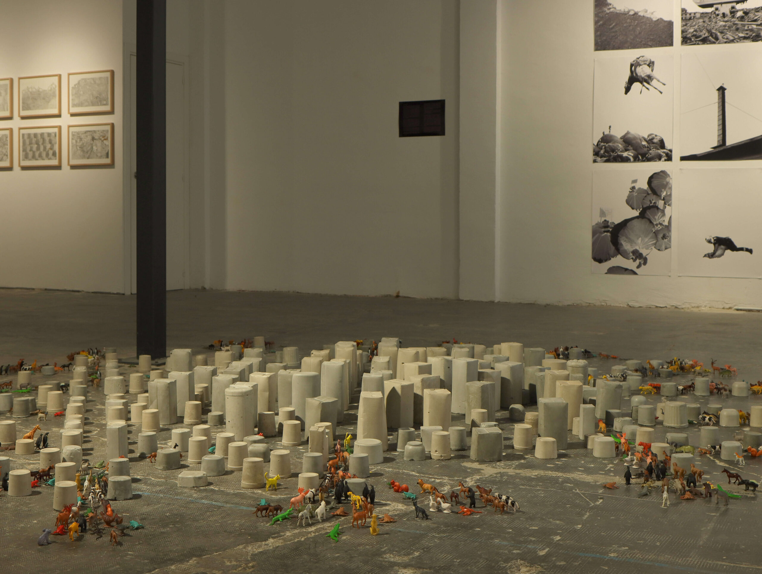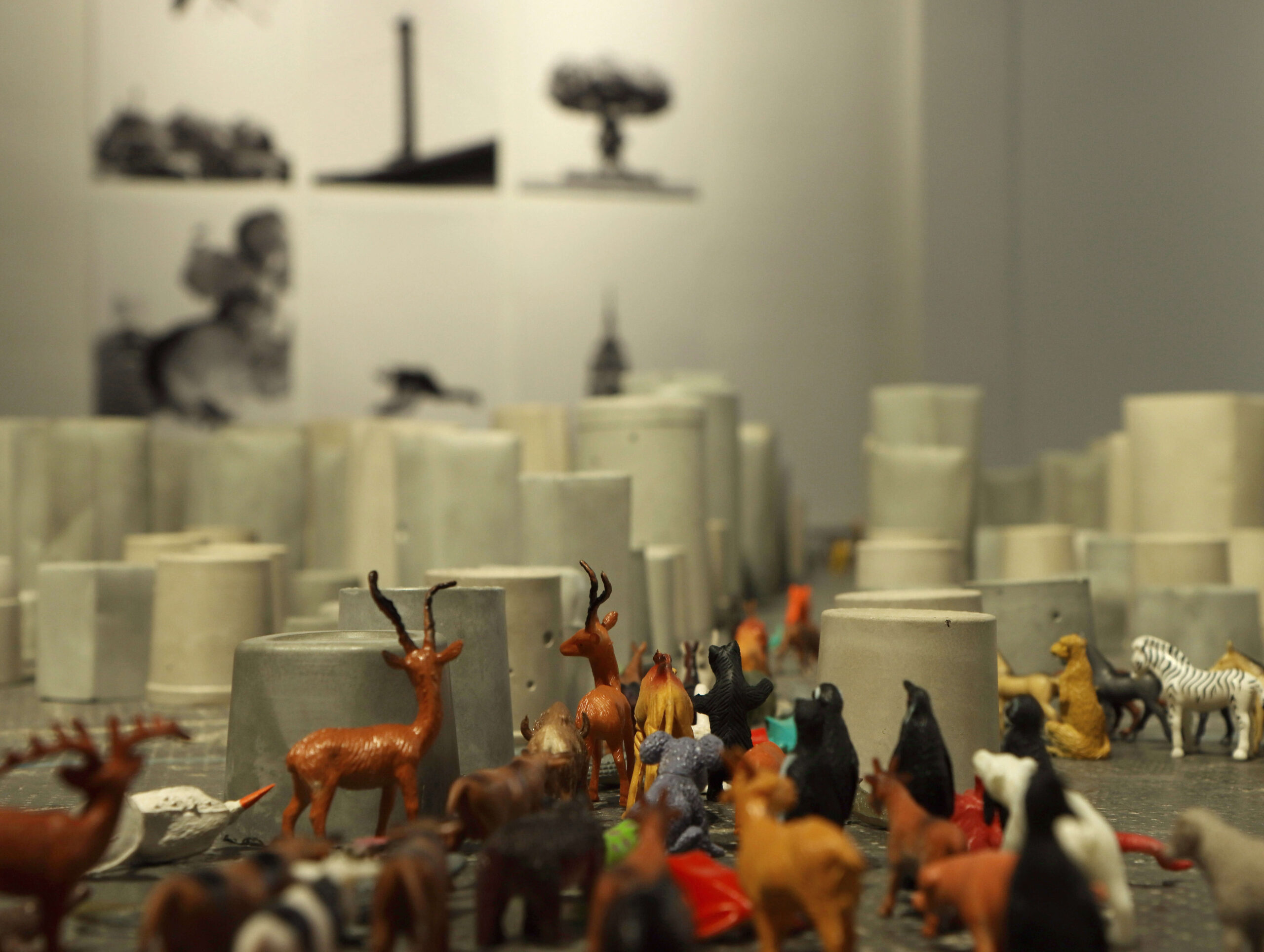 State of siege, Installation with cement molds, plastic animals and audio, 2021