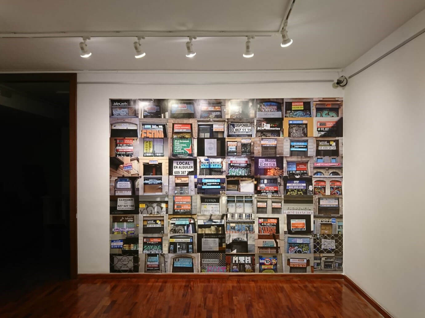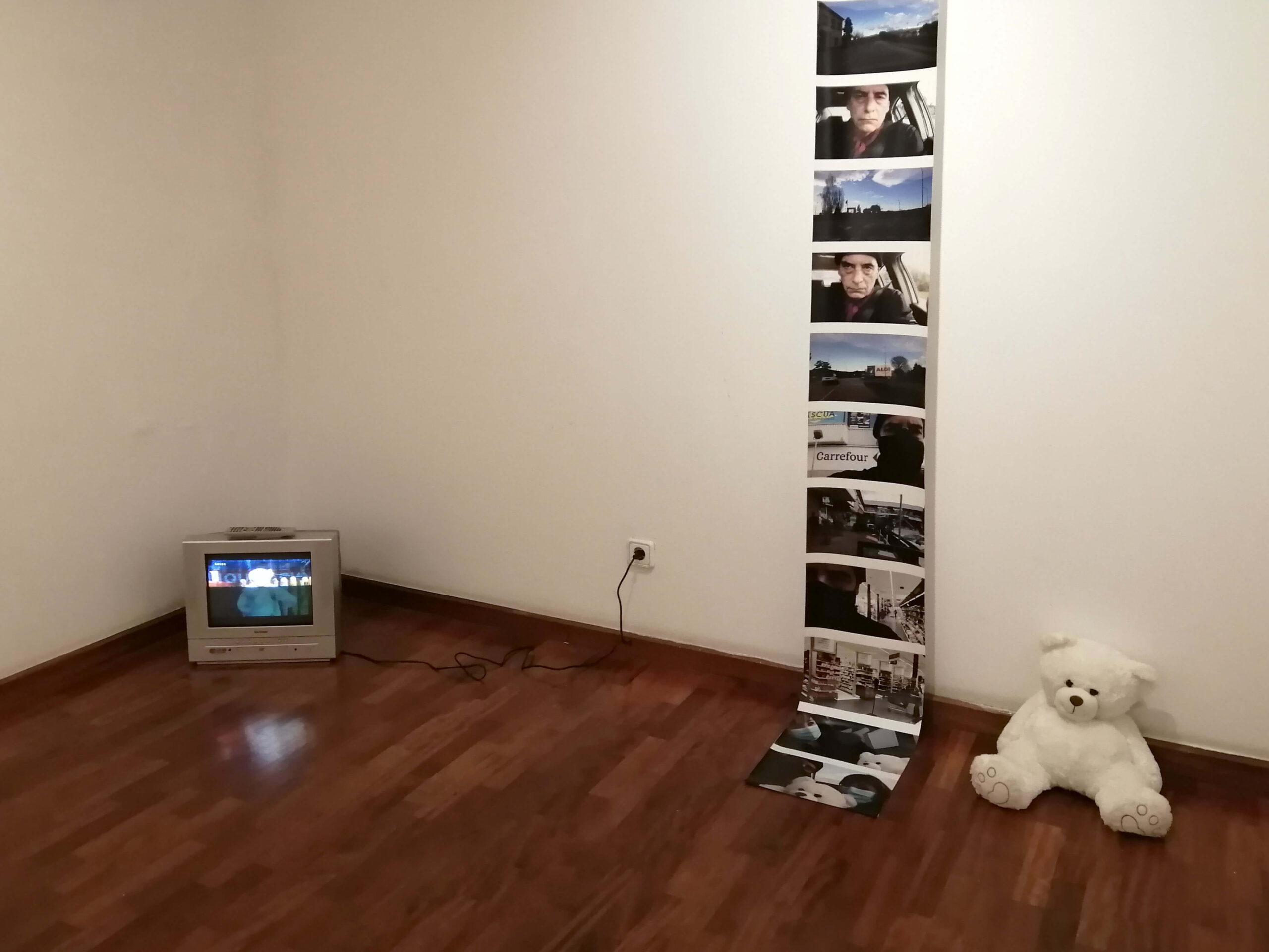Liquidació per tancament, Installation with tarpaulins, projection, photos, texts and teddy bear, 2021