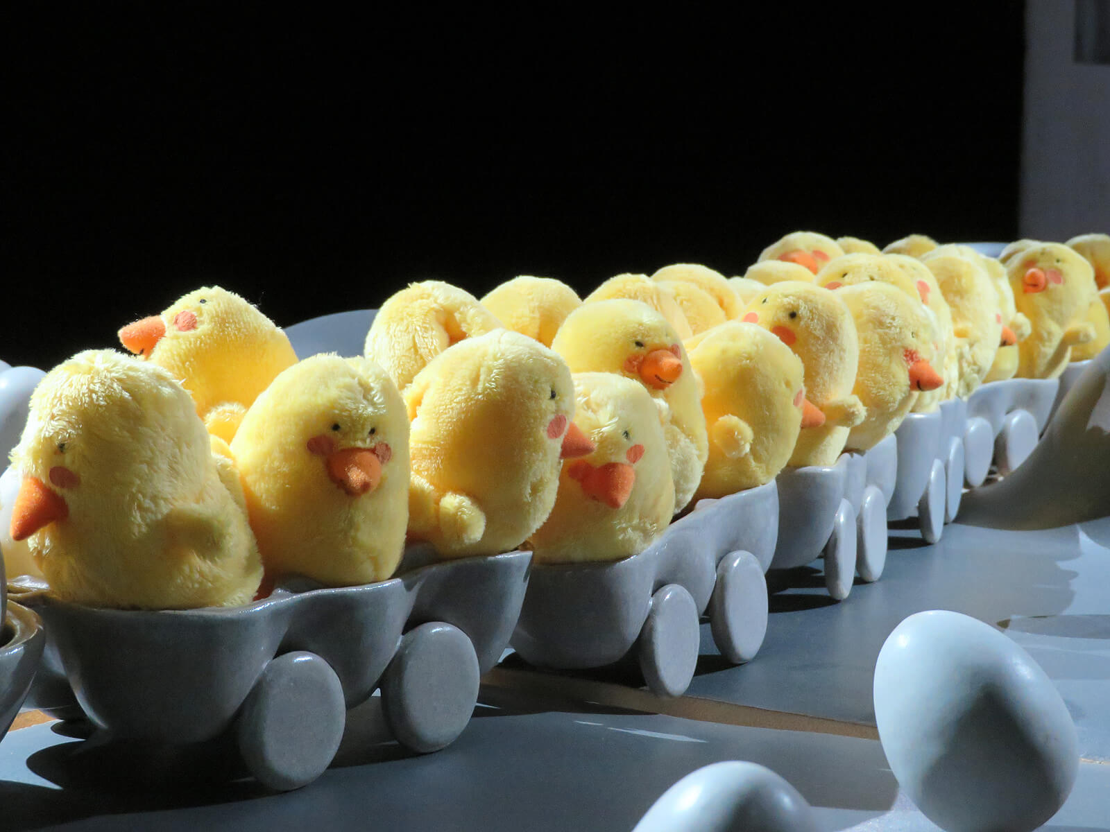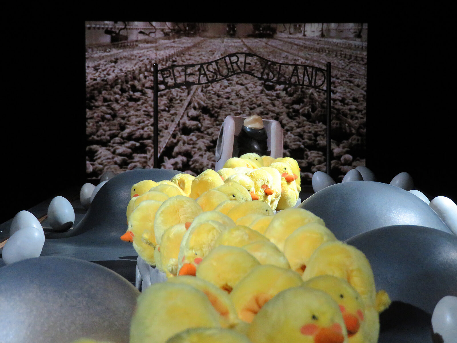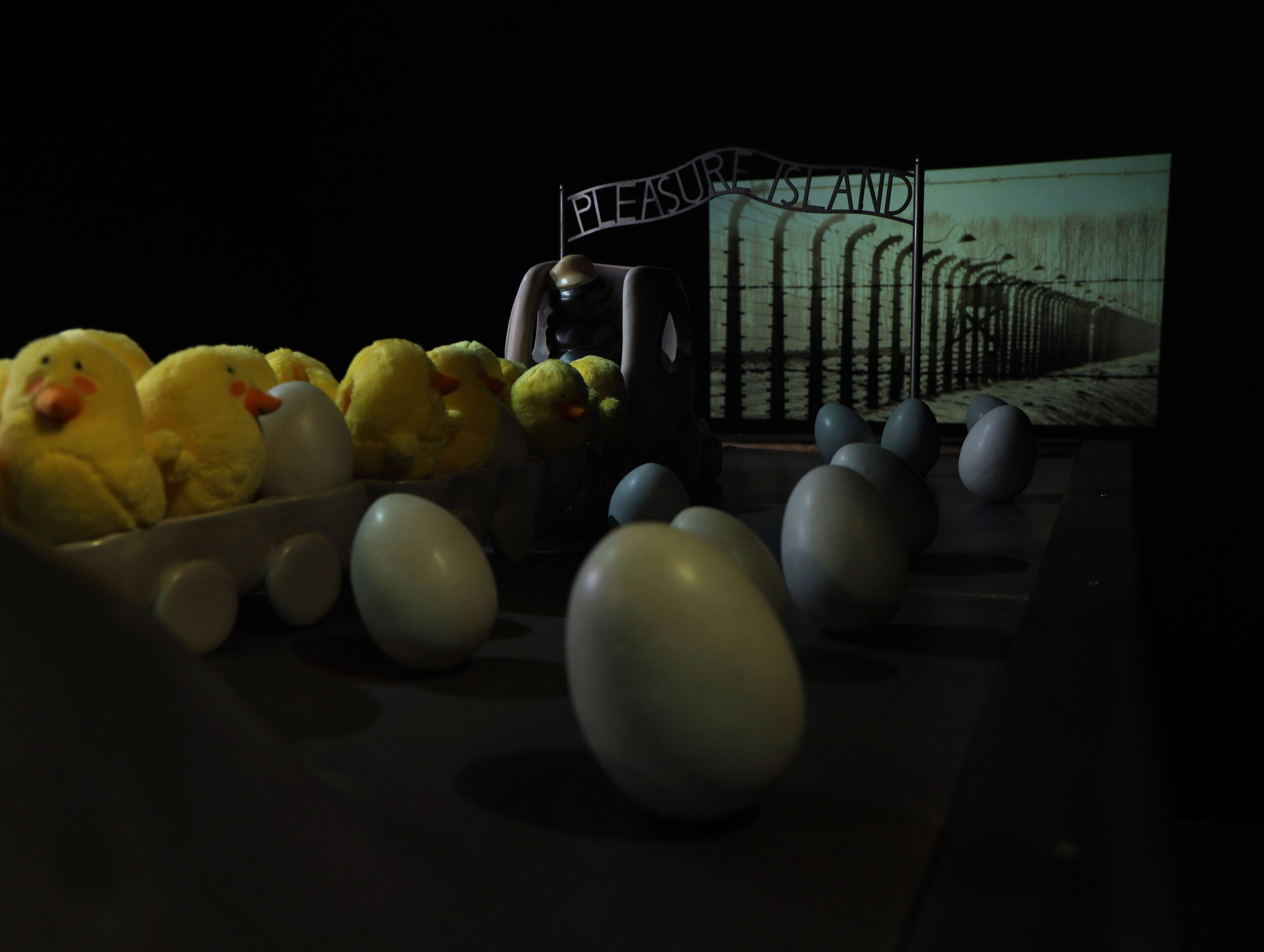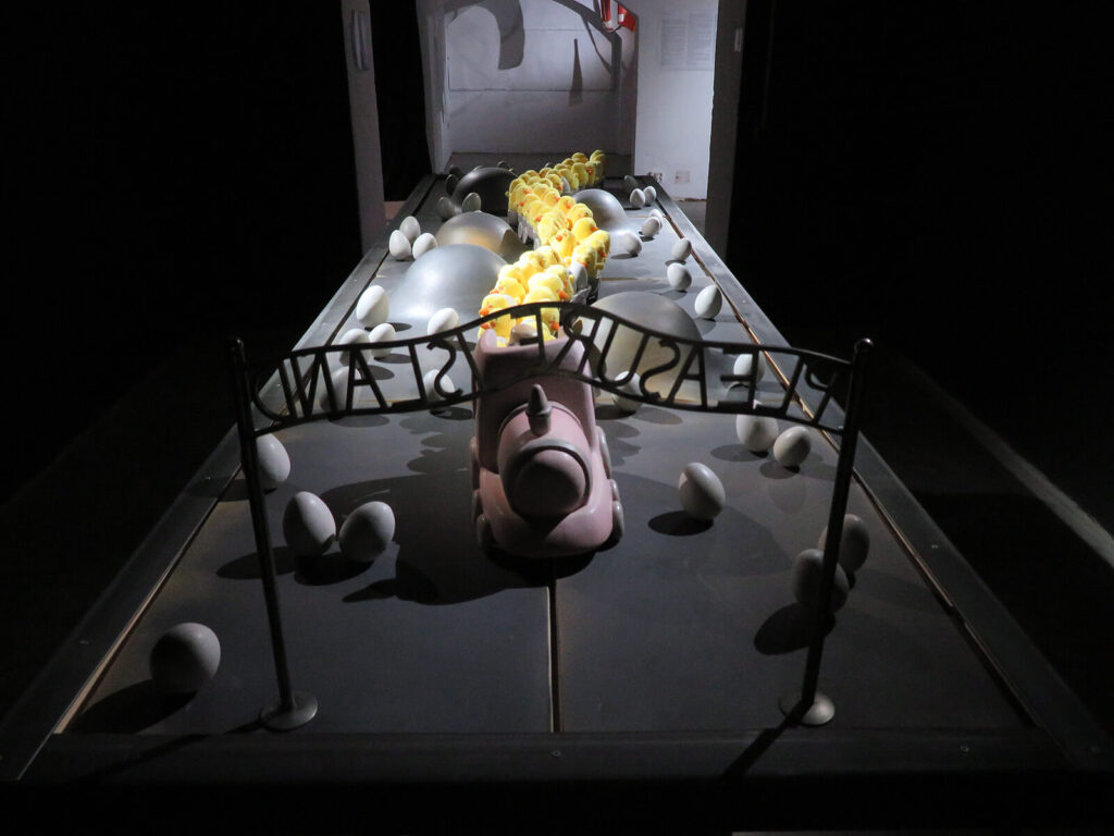 Le Grand Voyage, Installation with metallic structure, landscape and ceramic train, stuffed animals and diaporama, 2020