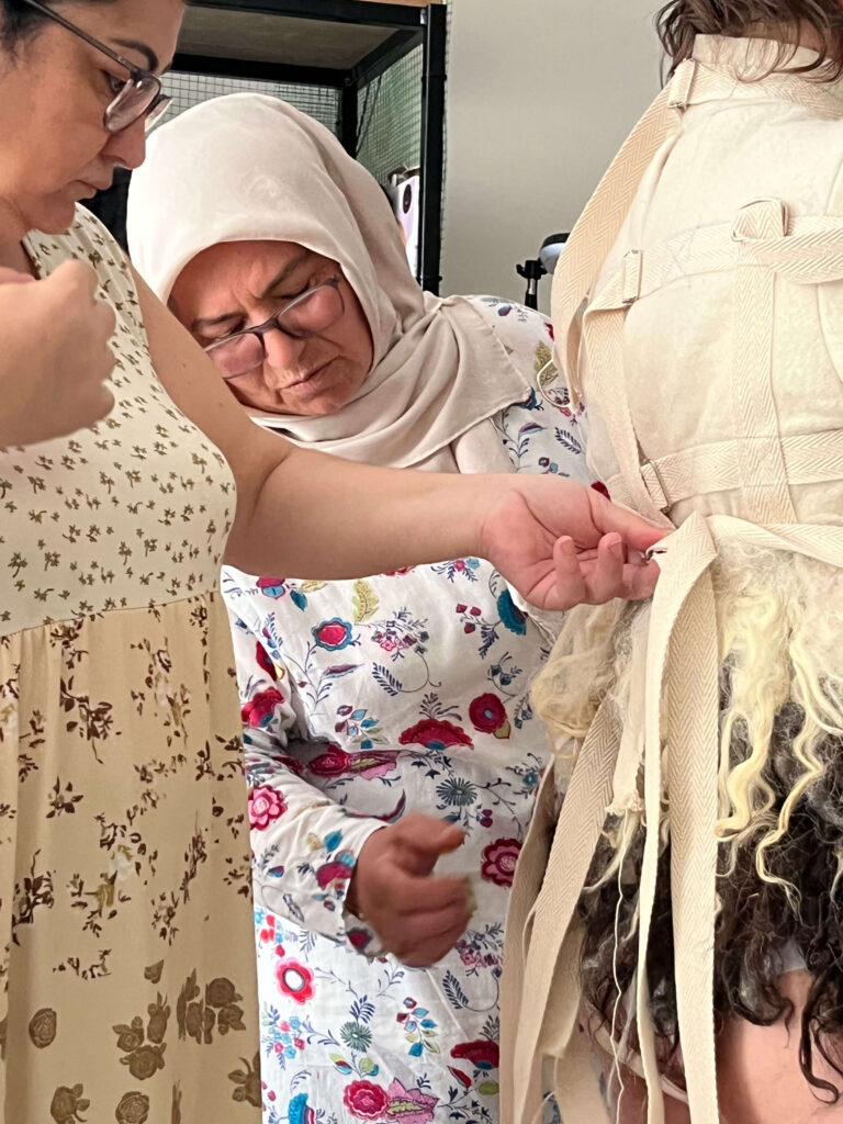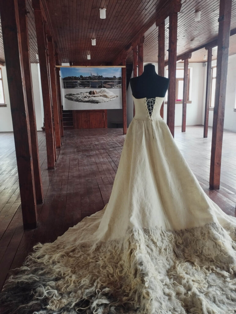 Its first public action took place in the café of Ekşidere — a male-dominated space temporarily reclaimed by women — where participants were invited to part with symbolic objects tied to their family wounds. From this ritual emerged a series of wool-based works that revisit archetypal female “uniforms”: a wedding dress, a straitjacket, and a maid’s apron, all handmade by local artisans. Exhibited in 2025 at the Cardedeu Museum (Barcelona) and the Gönen Museum (Balıkesir), these pieces reveal how traditional know-how can become a language of emancipation.