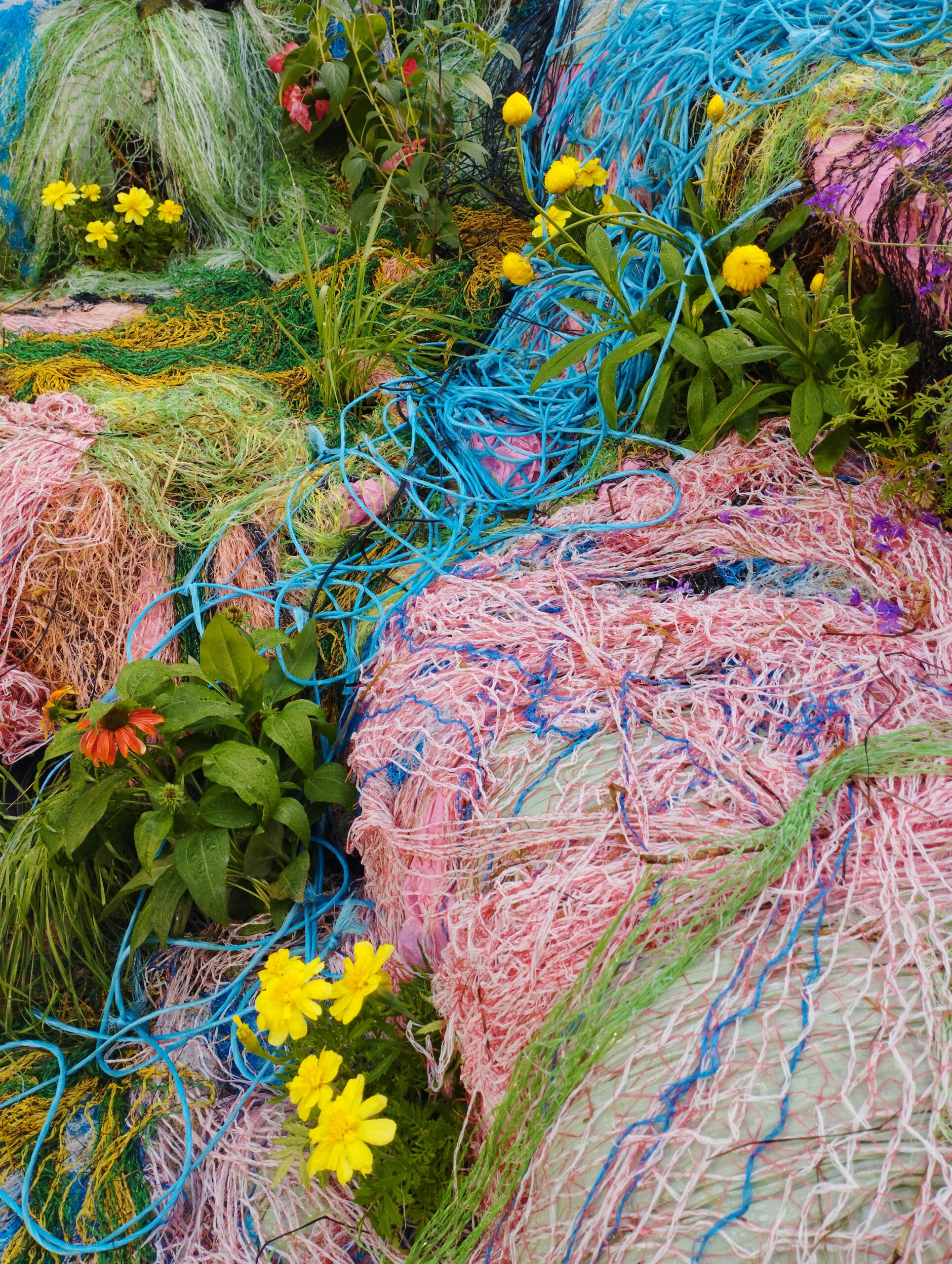 Through a sculptural arrangement of straw bales, agricultural nets and fleshy flowers, the artist translates visually the confusion between the living and the synthetic, between beauty and waste. Her “garden” denies the existence of an ideal, romantic nature and instead reveals the radical hybridity of our contemporary environments.