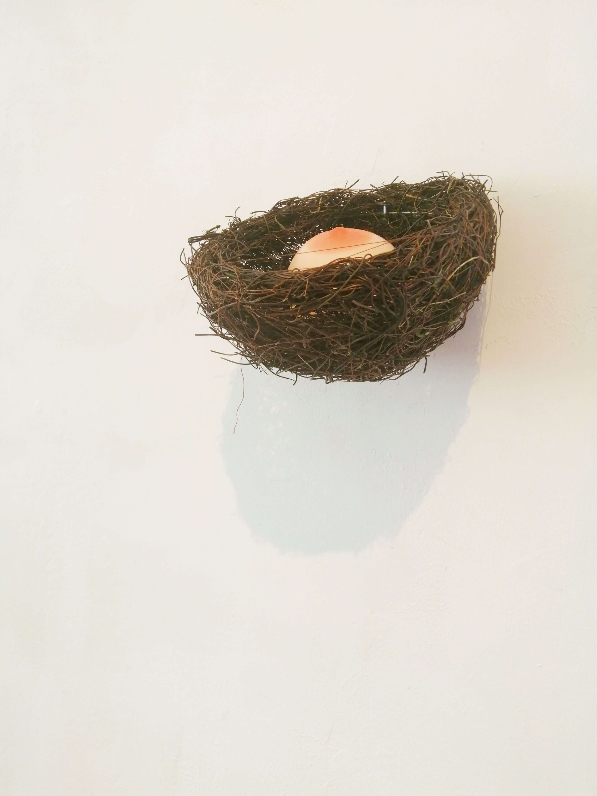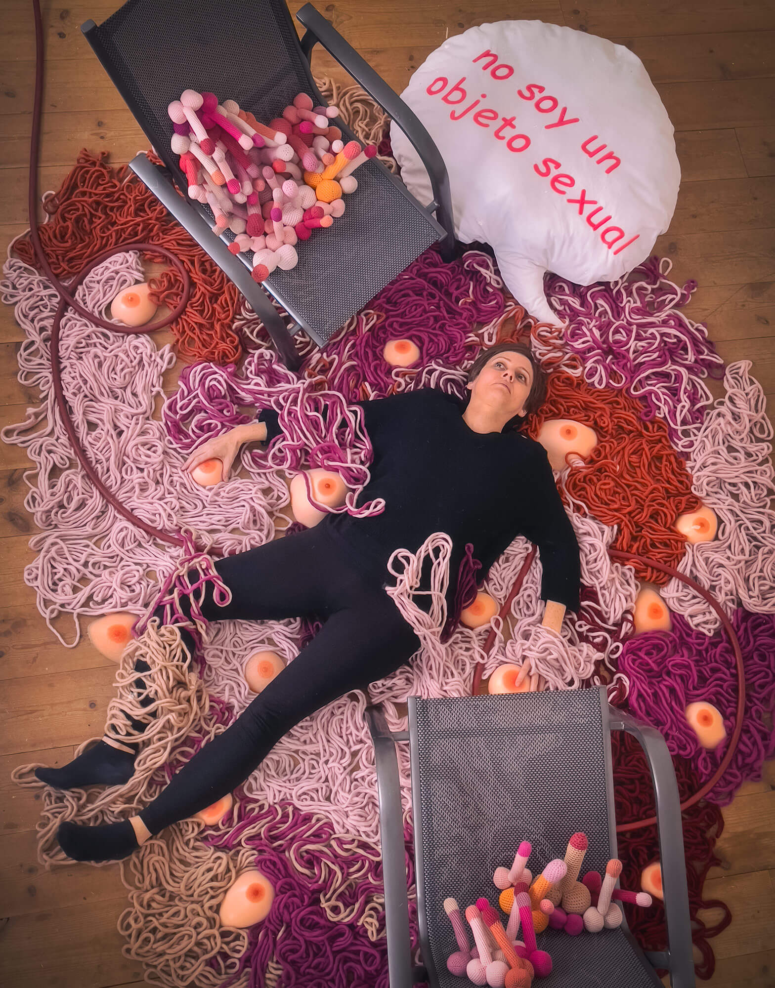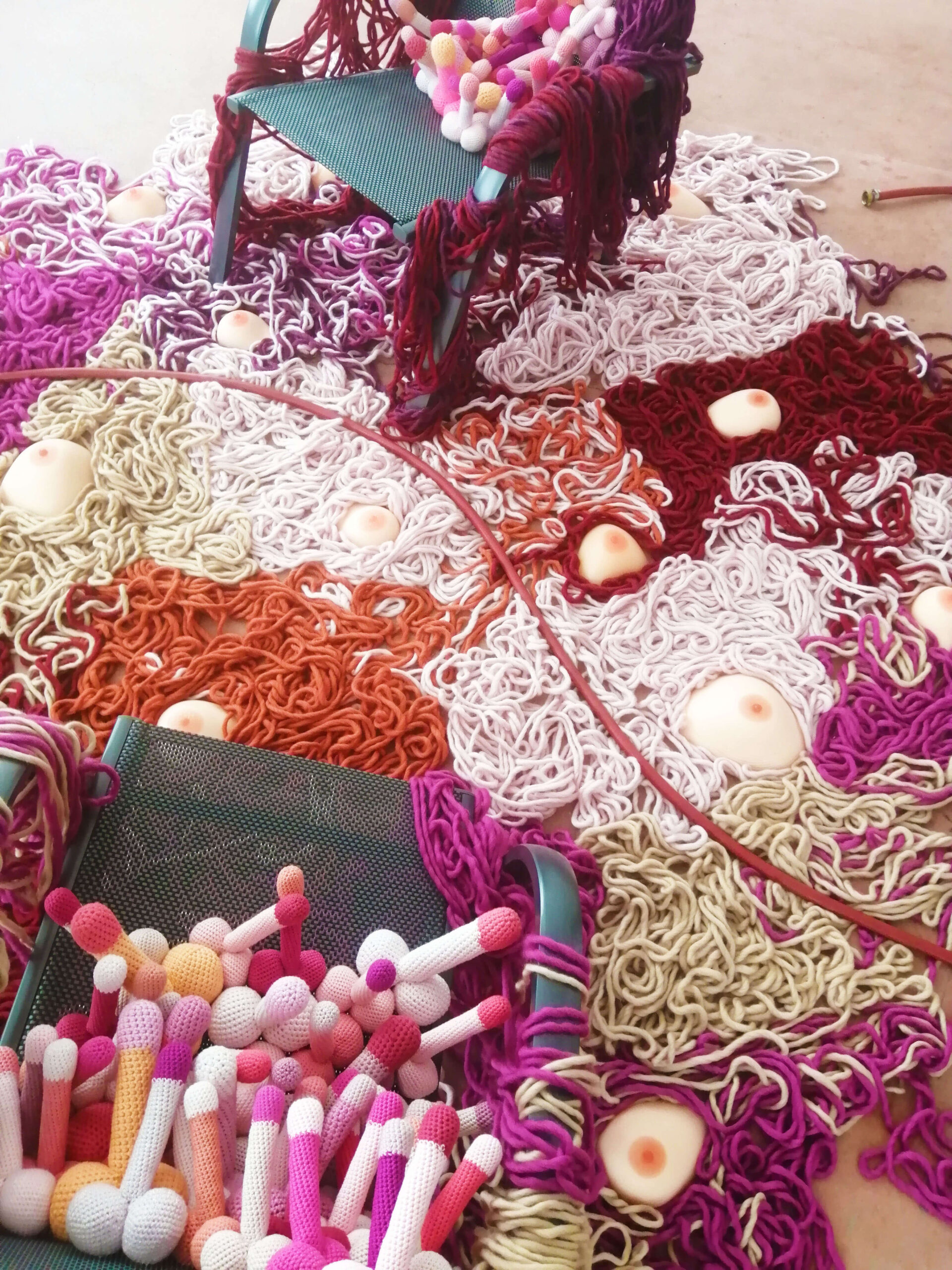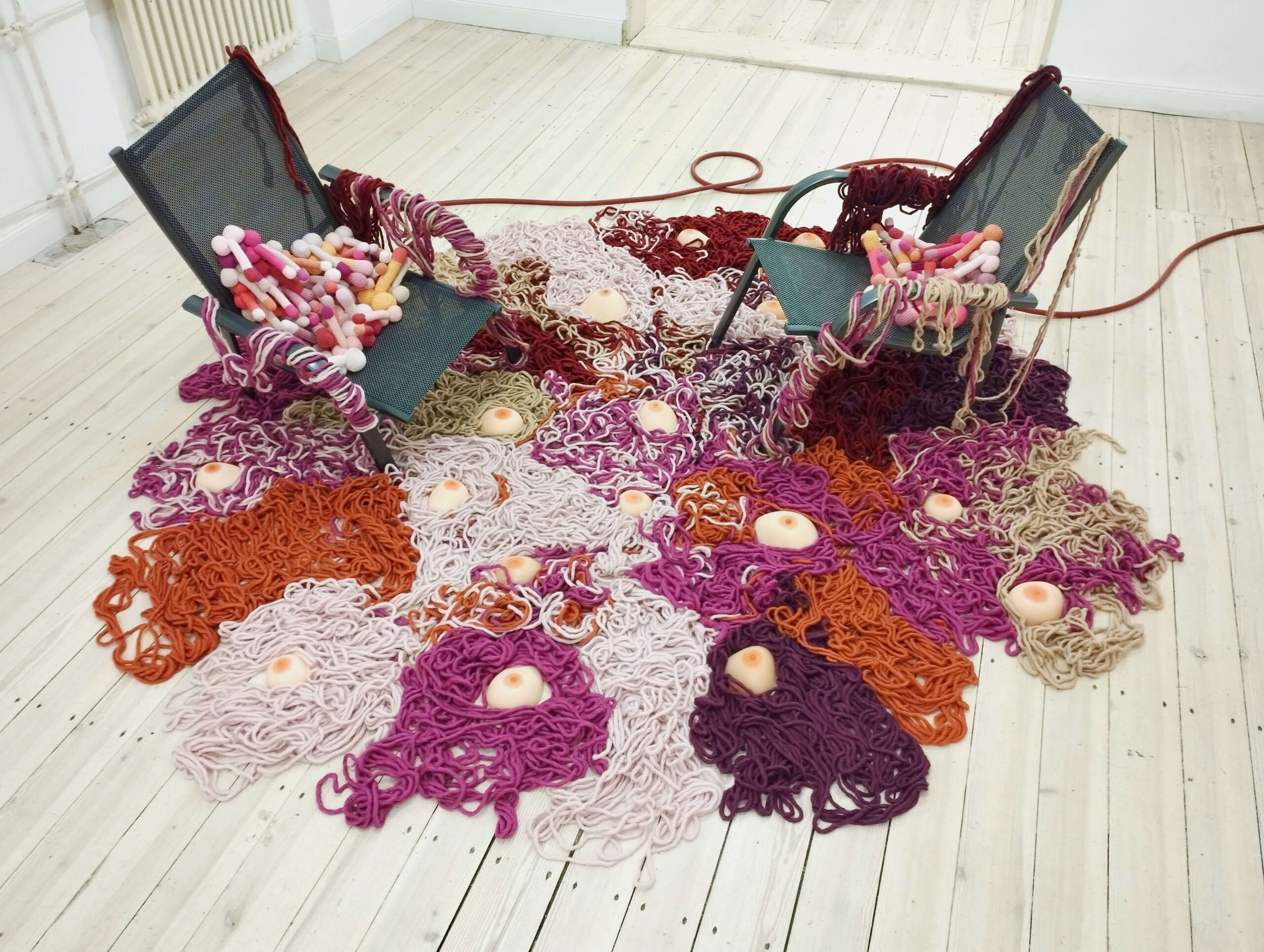 Installation with garden chairs, crocheted penises, silicone breasts, wool, hose and nest