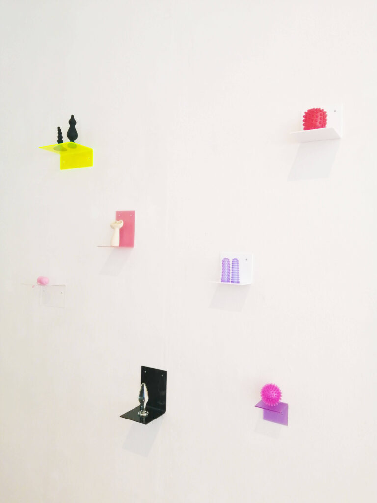 Set consisting of plexiglas shelves, sex toys and a ceramic sculpture by Cécile Ribas