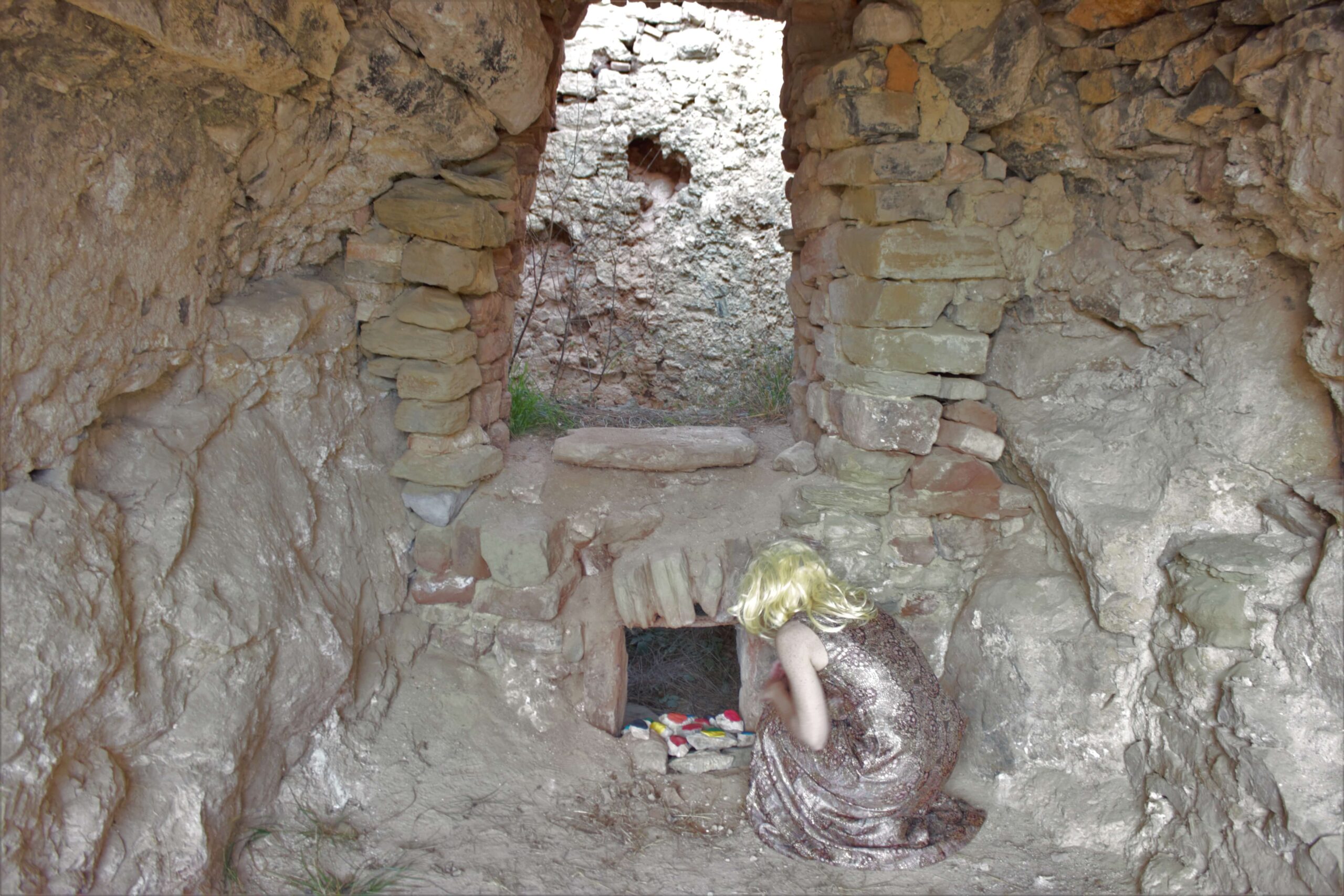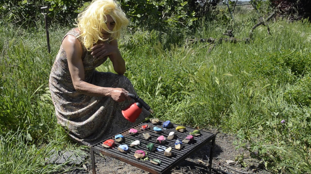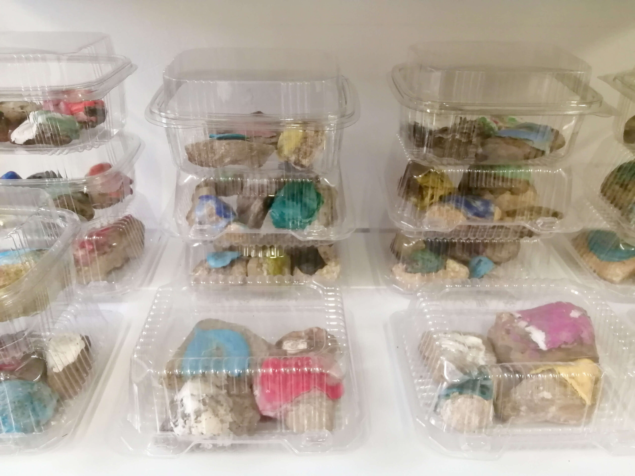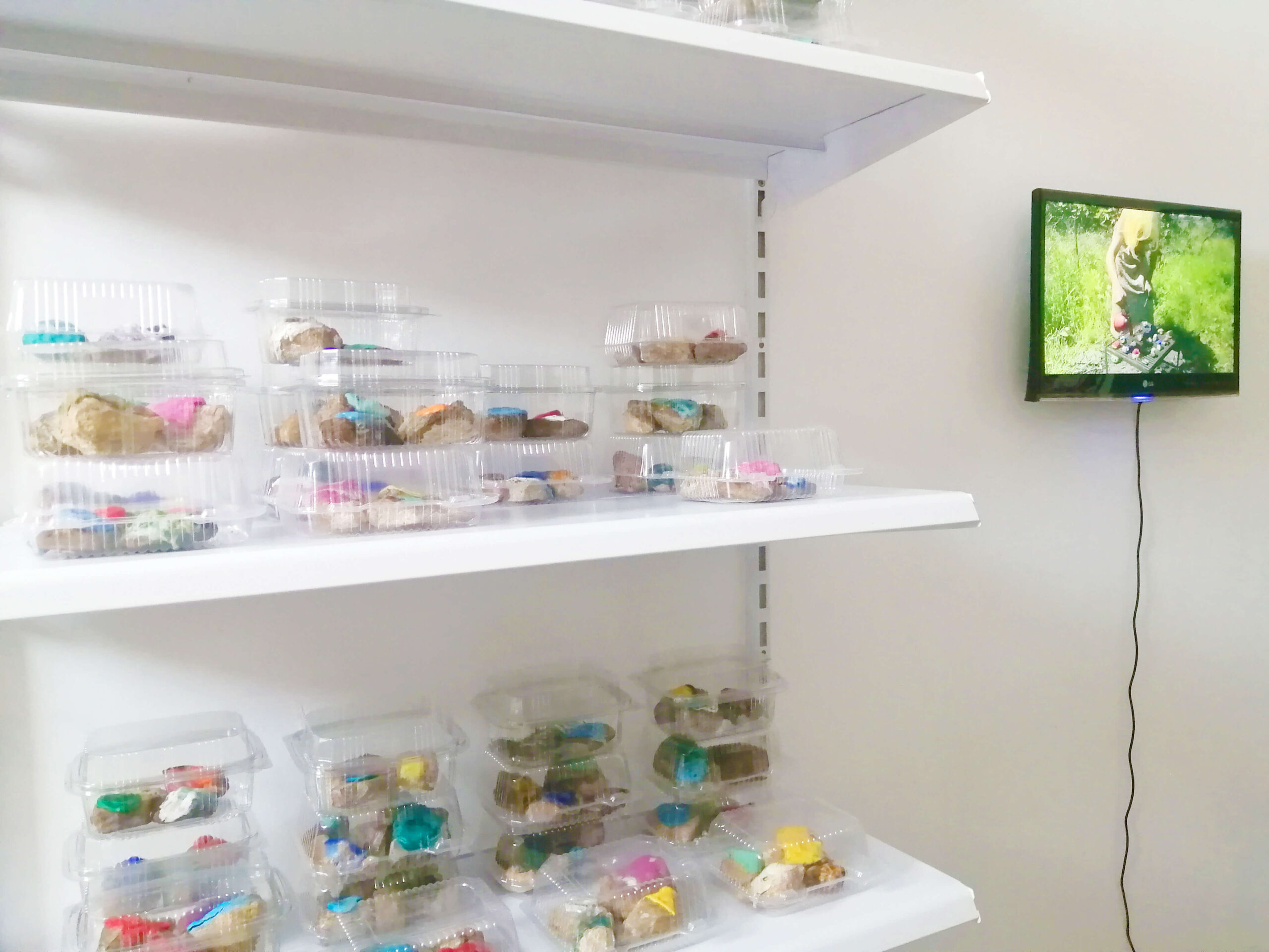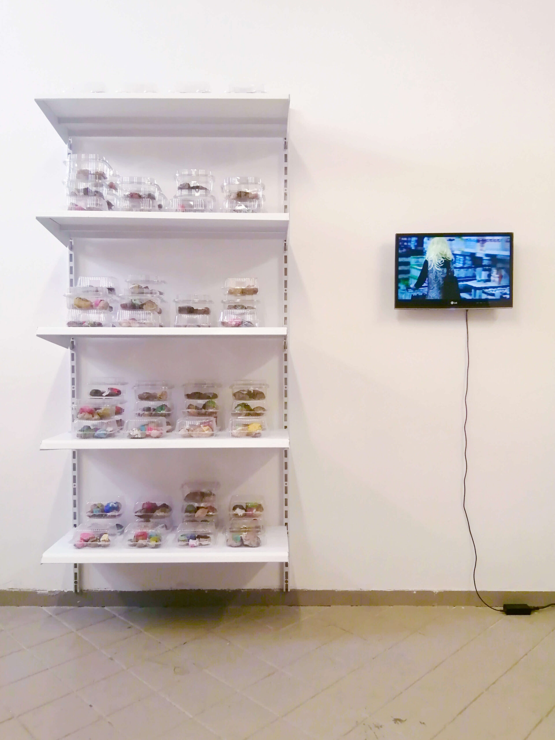 Created during an international research residency at CACiS – Contemporary Art and Sustainability Centre, Calders, Catalonia – The Philosopher’s Stone by Nathalie Rey and Enric Maurí is a video installation that explores transformation, artifice, and the blurred boundaries between nature and consumption. The project includes a supermarket-style metal shelf displaying profiterole boxes made of stones wrapped in melted plastic, and a 14-minute single-channel video. The short film was selected for the 2021 edition of Panoràmic Festival (Barcelona), dedicated to cinema, photography, and new media.