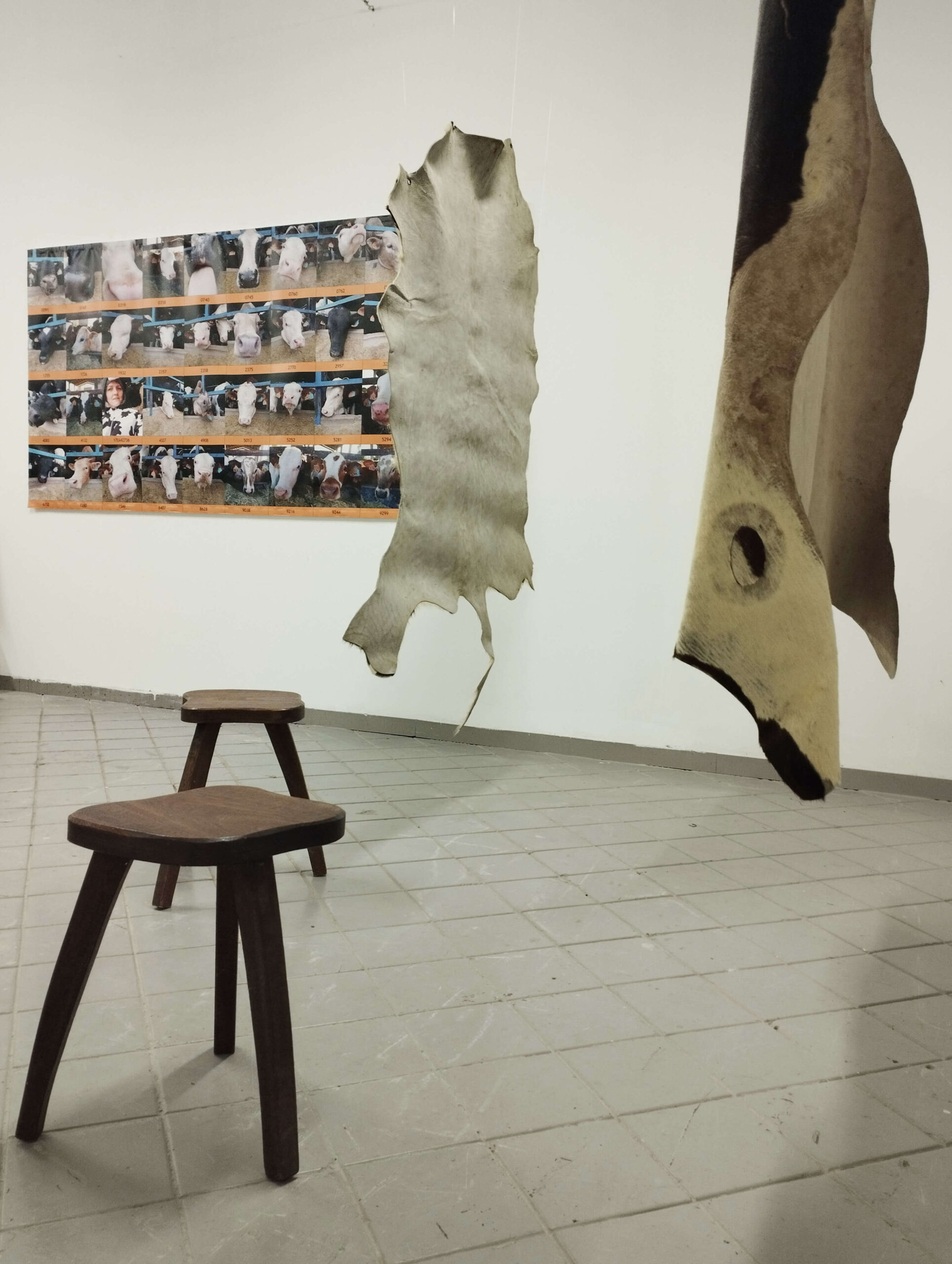 Rooted in personal memories and family ties, the narrative emerges from the artists’ intertwined experiences: Nathalie’s childhood on her grandmother’s island in northern France, and Enric’s early encounters with rural life and the act of milking cows. The film’s title and central motif refer to three cowhides inherited by Nathalie from her grandmother upon the sale of her family home — relics that carry traces of care, labor, and inheritance.