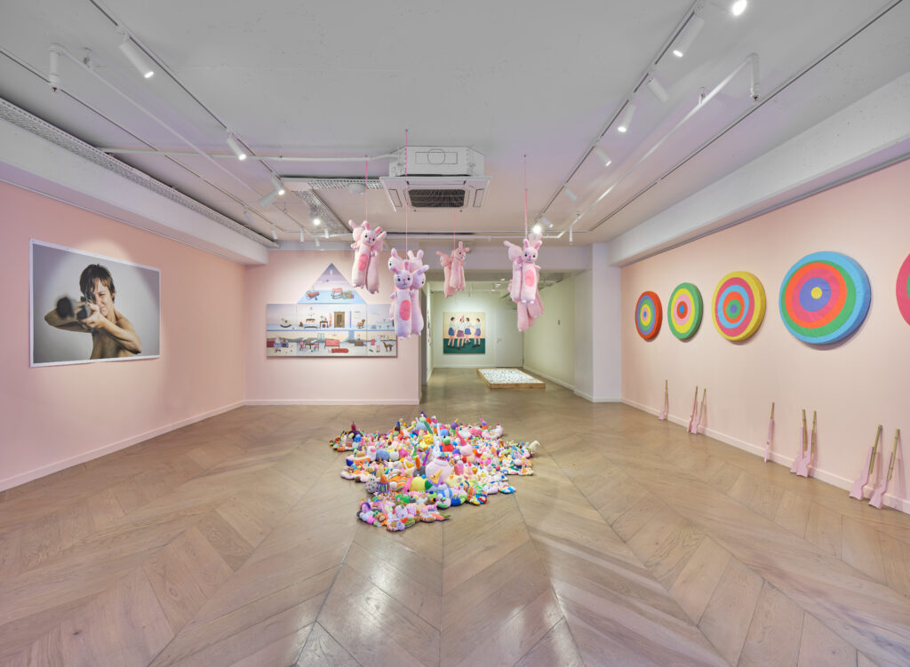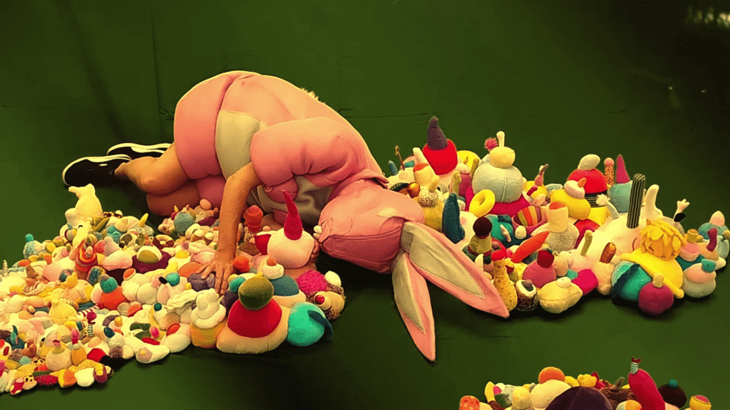 The first chapter, presented in an exhibition of the same name, explored consumer society and Baudrillard’s notion of hyperreality. Hand-sewn objects, immersive environments, and the short film Pink Bunny’s Travels formed a narrative where a lost alter ego wanders through urban labyrinths — both victim and mirror of a hyper-simulated world.
