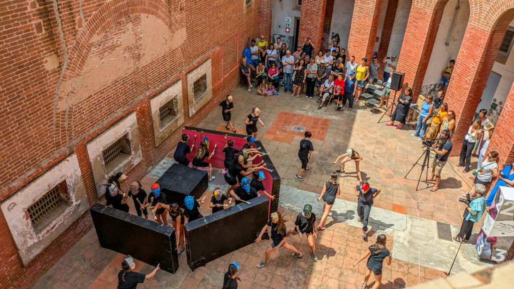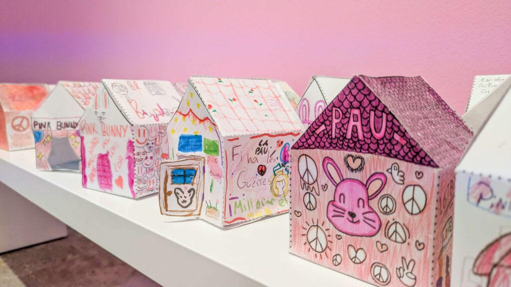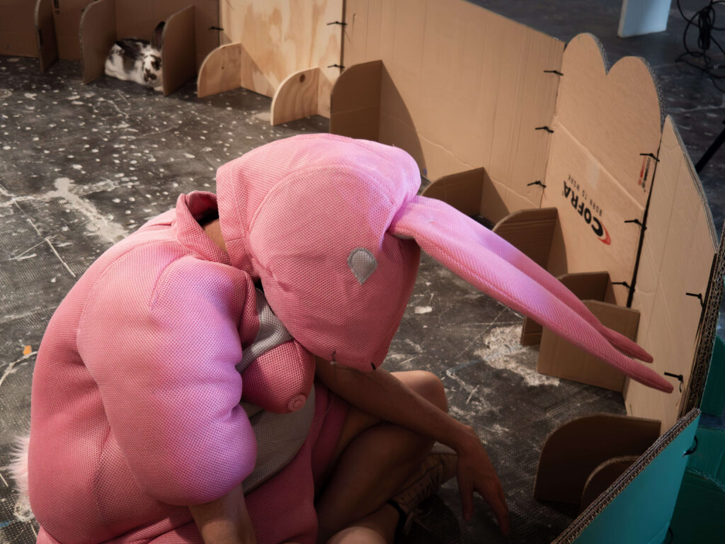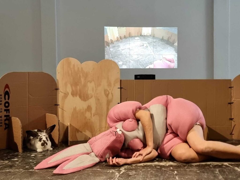 The performance Caged (Alalimón gallery, Barcelona) deepened this reflection: confined in a cage with a real rabbit, Rey embodied the fragile border between nature and culture, freedom and control. Meanwhile, the educational project PING PONG, developed with the Montserrat Solà School and the M|A|C (Mataró), expands these questions through collaborative workshops where children build shelters for Pink Bunny and reflect on vulnerability and coexistence.